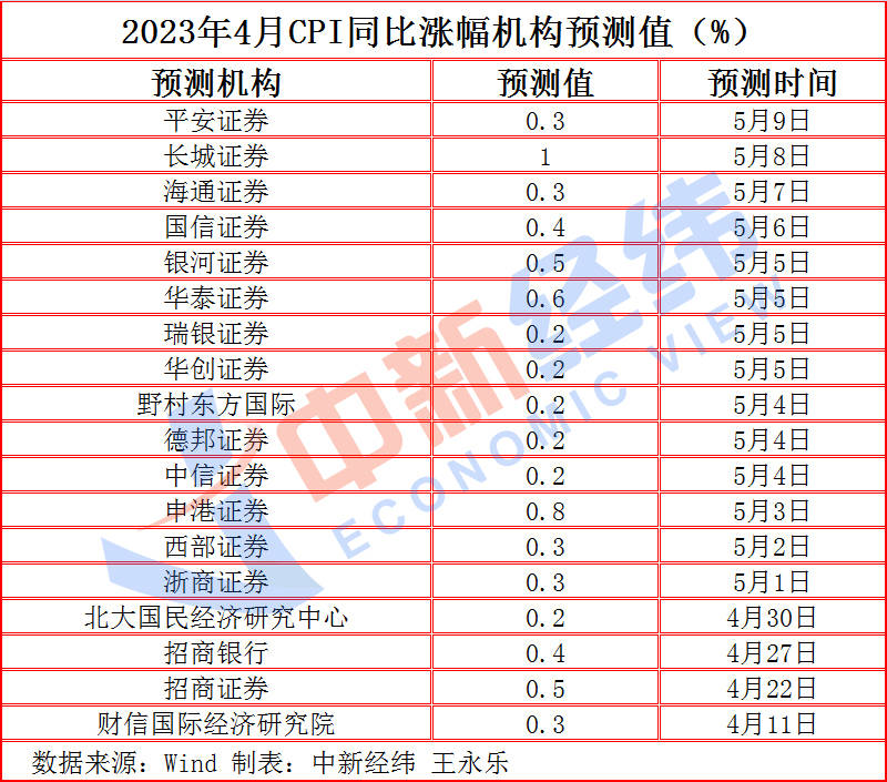 11日上午,国家统计局将公布2023年4月居民消费价格指数(CPI)。多家机构预测的均值显示,4月CPI同比上涨0.4%,涨幅连续三个月下滑。