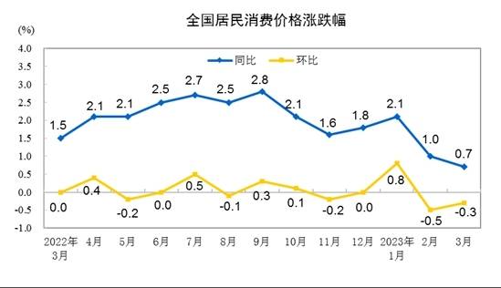 国家统计局数据显示,3月,全国CPI环比下降0.3%,同比上涨0.7%。CPI同比增速低于市场预期,且连续两月回落。