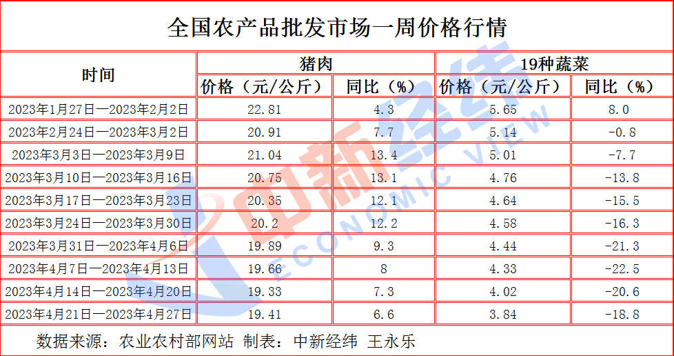 农业农村部数据显示,4月,猪肉、蔬菜批发价格继续处于回落通道,截至4月27日当周,猪肉及19种蔬菜批发市场周均价为19.41元/公斤、3.84元/公斤,分别较截至3月30日当周均价下跌3.91%和16.16%,同比分别上涨6.6%和下降18.8%。